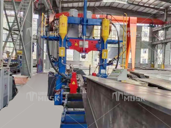 ● 將工件輸送主機(jī)內(nèi)通過(guò)主機(jī)內(nèi)的對(duì)中裝置進(jìn)行精確對(duì)中,同時(shí)上壓輪下壓消除腹板與翼板之間的間隙,工件繼續(xù)前行端部自動(dòng)對(duì)齊,焊槍進(jìn)入工件并在端部啟動(dòng)自動(dòng)進(jìn)行焊接,接著工件進(jìn)入矯正區(qū)進(jìn)行翼板的矯正。
